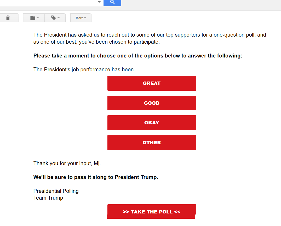 Team Trump’s Presidential Polling brain-trust just unleashed into my email account one their more highly polished polls. However, since I detest the man with an intensity that would melt what’s left of the Arctic ice caps, I don’t know how I got tagged as being among “some of our top supporters, and as one of our best.” Perhaps people like me are all the support he has remaining. In his own words thst’d be “SAD!”